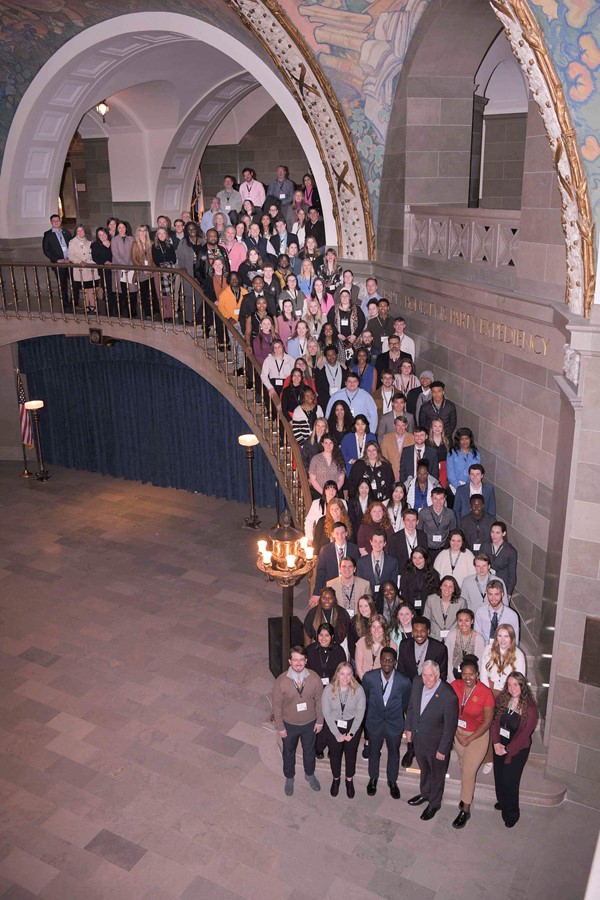 Governor Mike Parson welcomed students of the Forum with a meet and greet in his office, followed by an inspirational message from Rebecca Welsh, Founder of Halo, a mission that provides housing, healing, and education to at-risk and homeless children. Students ended their time at the Capitol hearing from Missouri State Senator Travis Fitzwater.